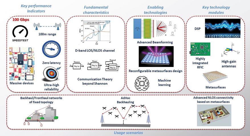 Scenario 1 – Backhaul/Fronthaul networks of fixed topology, where small-cell traffic may be carried over D-band links. In particular, the connectivity between small cells and the network aggregation point could be based on point-to-point, or mesh topologies. In such a scenario, apart from the high targeted aggregate data-rates, the critical system parameters are the transmission range, the capability to establish reliable line-of-sight (LOS) and non-LOS (NLOS) links, the energy efficiency, and the installation cost.