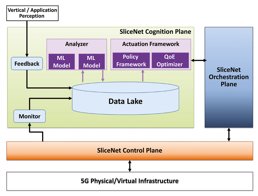 This article describes the Cognition Plane within SliceNet’s management layer as an architecture that allows for the QoE/QoS ML-aided management of 5G networks and vertical services. To this end, we described the several elements that constitute the phases of the full cognition MAPE-K-based loop. The main goal of the Cognition Plane is to enable the automated and QoE-aware management and control of end-to-end network slices as offered by DSPs to their vertical customers. In this regard, it is essential to provide the means for analysis of the underlying network slice and its components to determine its quality levels as well as for applying (re-)configurations when needed to maintain the desired quality levels.