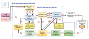 Each of the SMDs, including the E2E SMD, comprises a set of functional modules (e.g. security intelligence engine, security orchestrator, trust manager) that operate in an intelligent closed-loop way to enable software-defined security (SD-SEC) orchestration and management. This functionality will be further explained in the next section. Each functional module provides a set of security management services that can be exposed inside the same domain or cross-domain to the authorized consumers, using the domain-integration fabric or the cross-domain integration fabric, respectively.