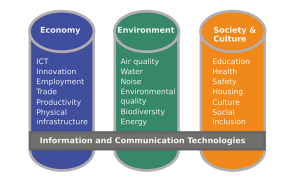 In 2015, the International Telecommunication Union (ITU) established a Study Group, SG20, on “Internet of things (IoT) and smart cities and communities (SC&C)”. SG20 defined a set of smart sustainable cities indicators for measuring the progress of cities towards becoming smart and sustainable. These indicators cover the economic, environmental, and social dimensions of sustainability (see figure).